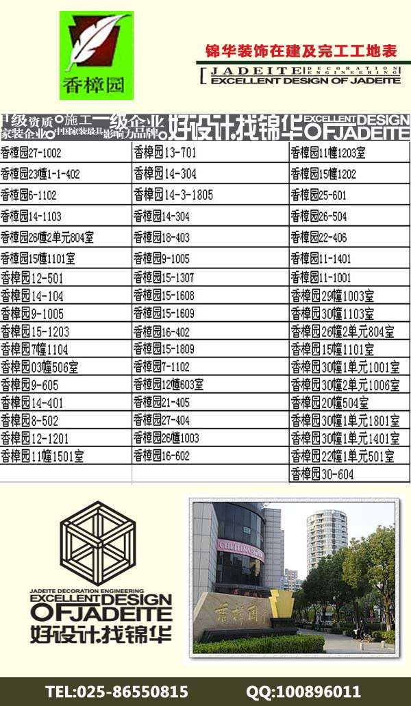 為了更好的讓香樟園的業(yè)主了解錦華裝飾的整個工藝流程,錦華裝飾仙林片區(qū)分公司整理了所有香樟園的完工及在建工地,歡迎大家來參觀。