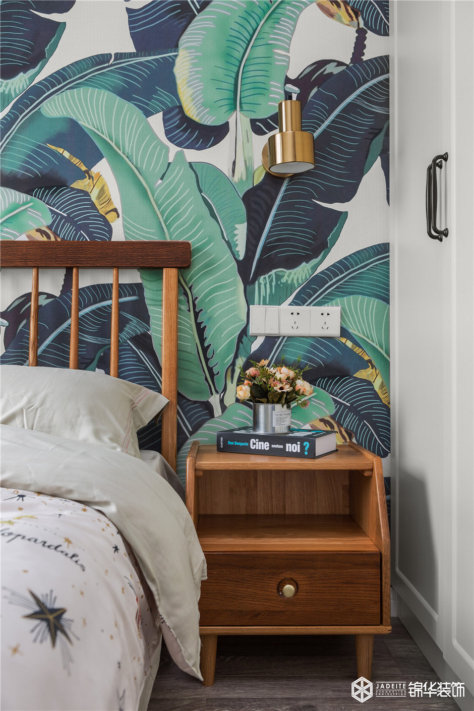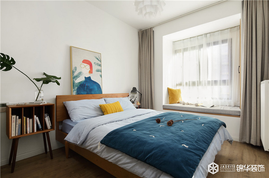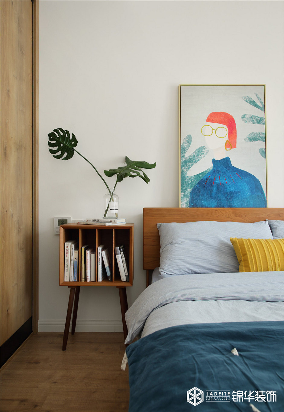 ▲臥室頂面和墻壁刻意保持干凈,藝術感的裝飾畫和恣意舒展的龜背竹給予空間一種簡潔、童趣和復古的調性!