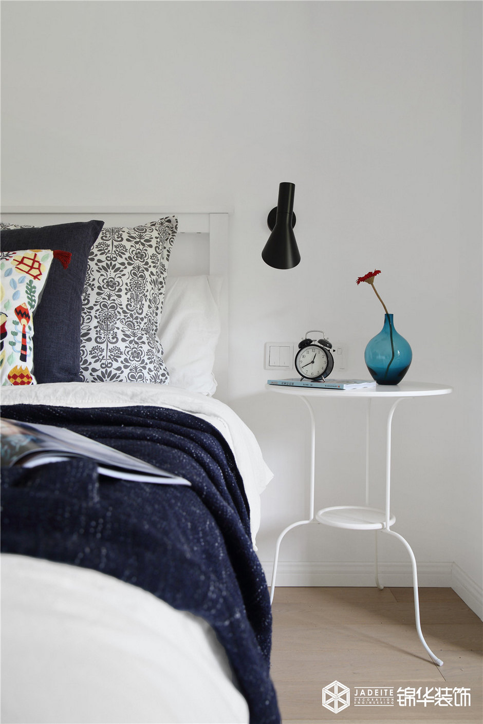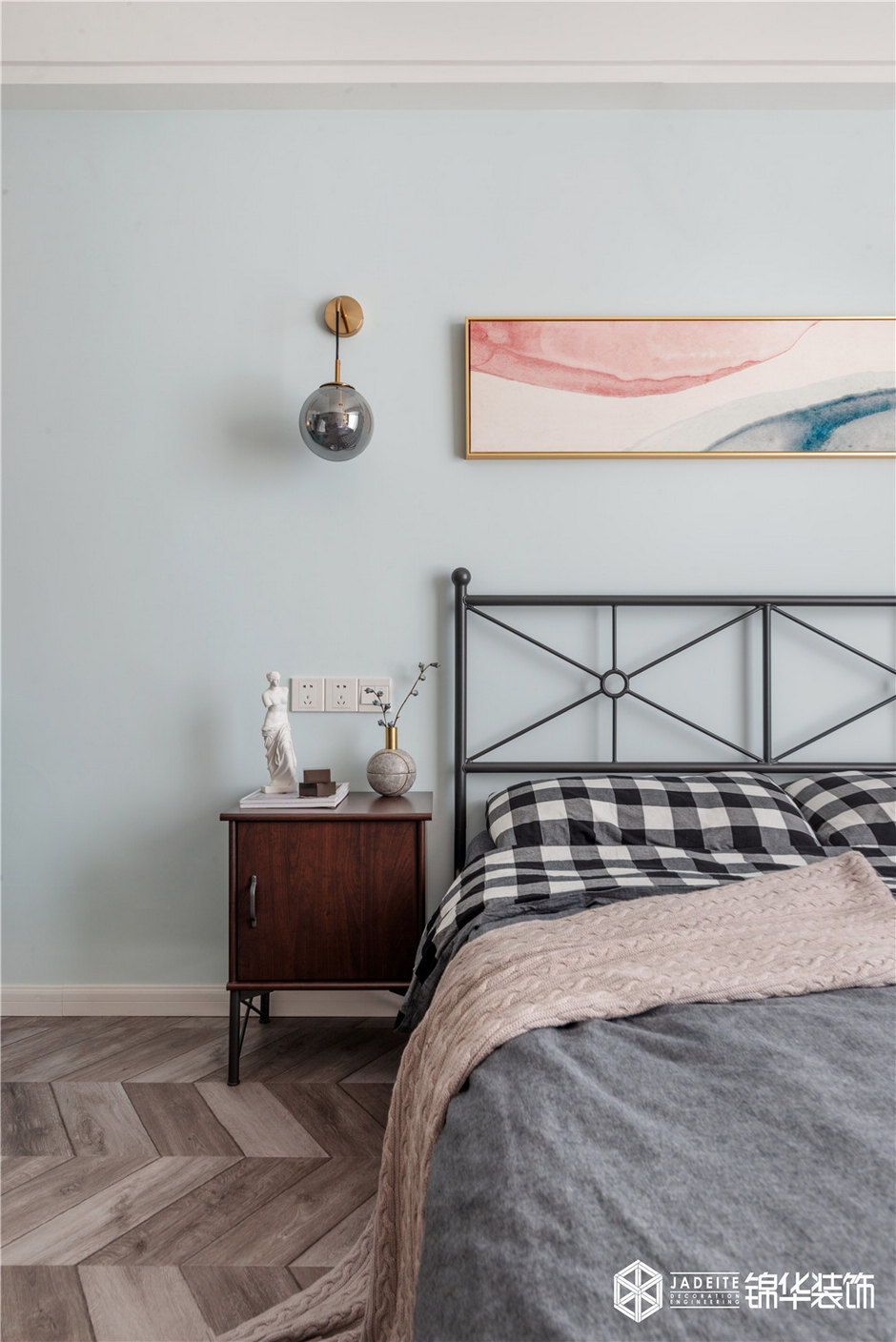 ▲休息的空間應該給人安靜的視覺效果,所以臥室里,不管是床品、裝飾畫亦或其他飾品,都以素色為主。