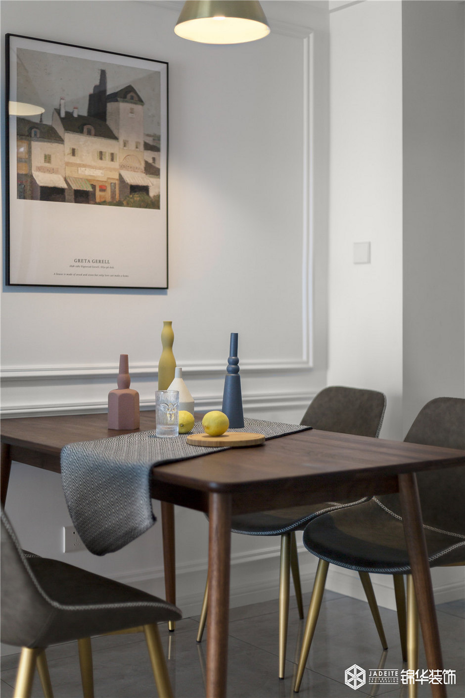 以pu線條代替造價甚高的護墻板,將其直接貼于墻面,增加了空間的層次感,其余的地方則是用不同色彩的墻紙體現空間的活潑性,呈現出空間本身的質感與美感,白色和灰色的組合又使得整個空間安靜又舒適。
