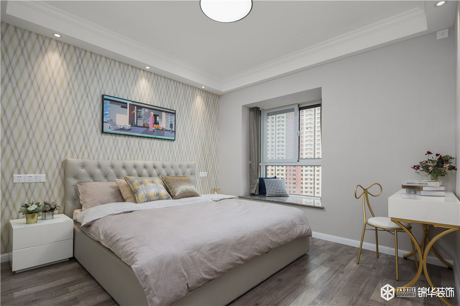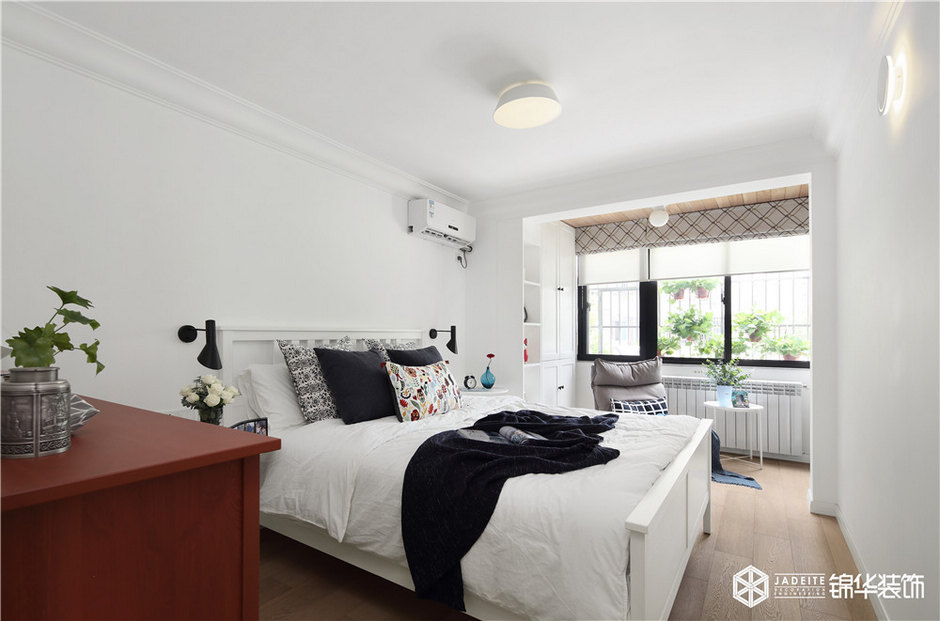 整個臥室空間以白色調為主,輔以恰到好處的醬紅色、木色等,再搭配以其他裝飾品等,讓整個空間看起來既寬敞舒適又格調十足。