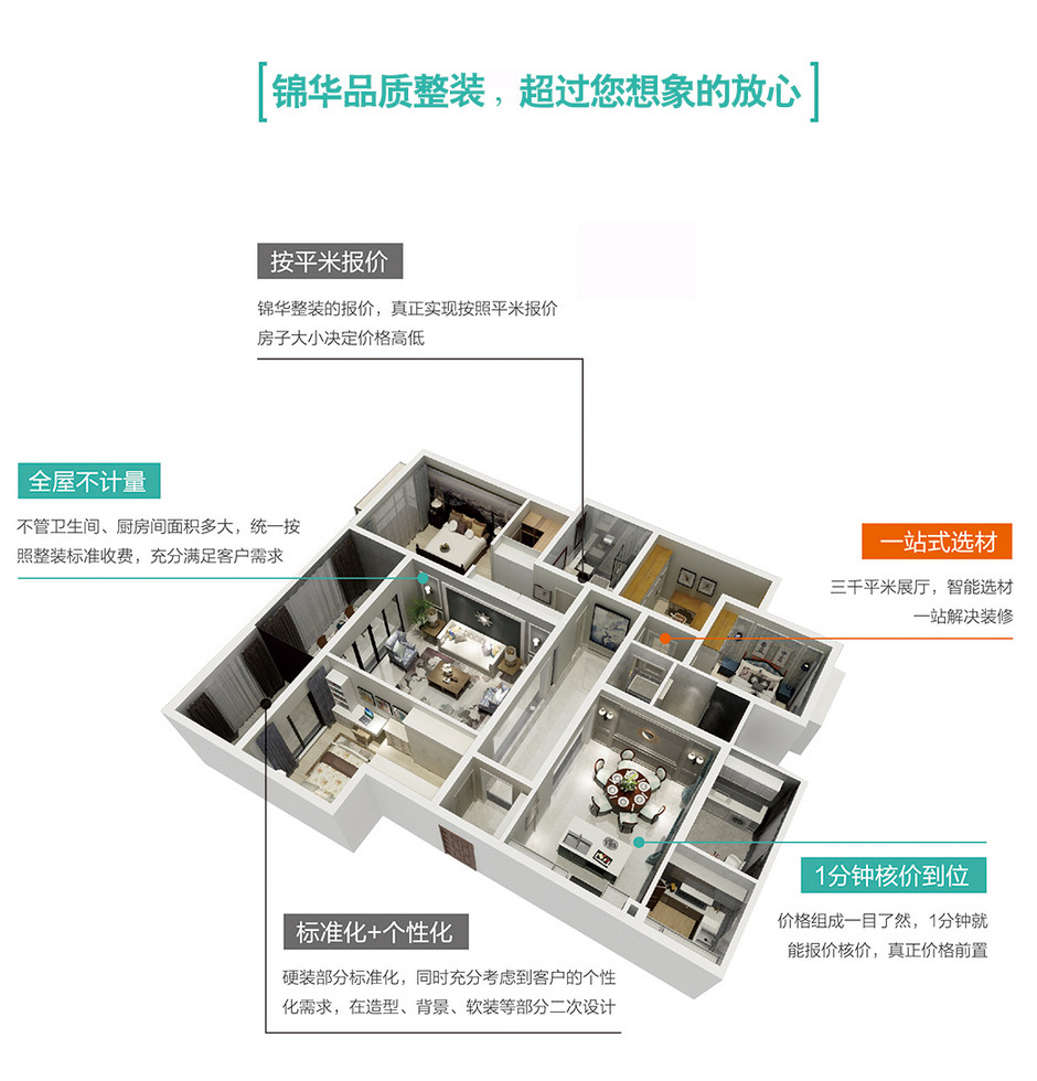 品質整裝,是指包含整裝設計、規劃、報價、服務;以家為單位,以全案設計方案貫穿,包含所有主材產品、硬裝產品、軟裝產品在內的個性化整體家居解決方案。