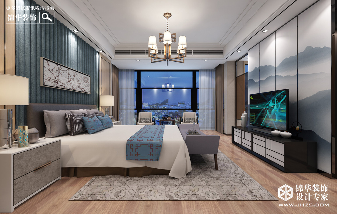 主臥并沒有因為自己是主人而特立獨行它將藍色的主色調進行到底,主臥與衣帽間之間采用定制的中式水墨畫作為隔斷,門采用的是麻紗設計讓整個空間既統一,又更加通透