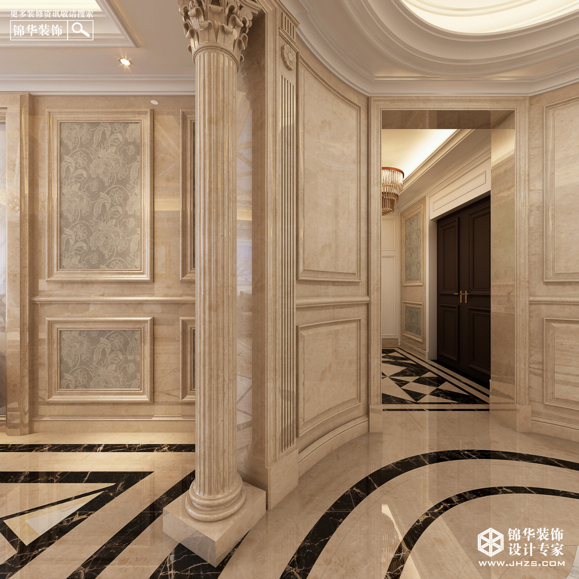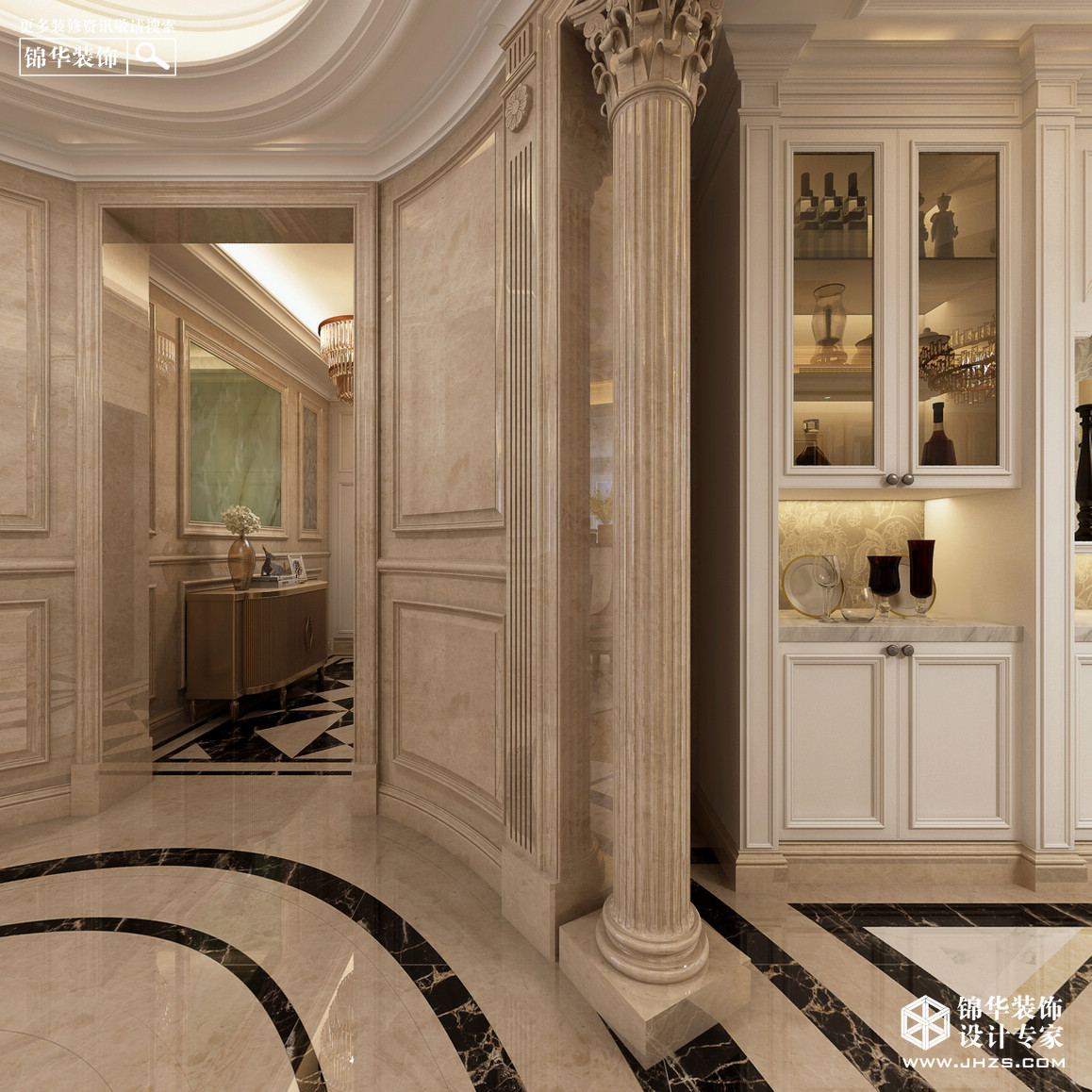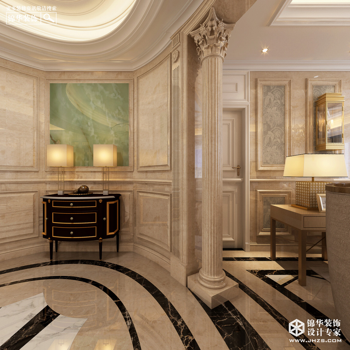 設計說明:本案作品將浪漫優雅的歐式和古典的法式精美的結合在一起。業主是位追求完美的人,喜歡歐式的羅馬柱和石材,所以設計師根據業主的想法也在一些細節方面做了精致的處理,從簡單到復雜、從整體到局部,精雕細琢,使各個空間的過度都顯得非常自然和諧。搭配歐式的家具,讓空間兼容華貴典雅與時尚現代,米黃色的整體色調,無不彰顯著生活的富足安寧和業主對品質生活的向往與追求。