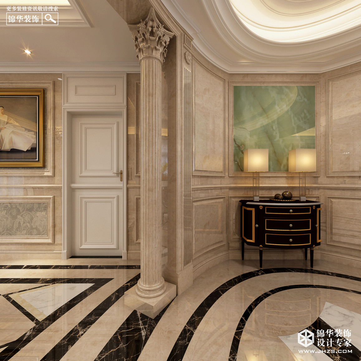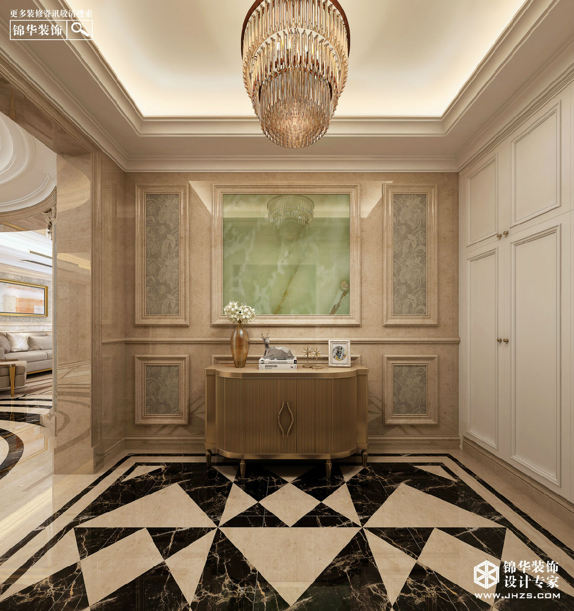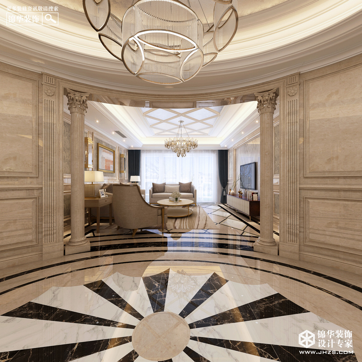 設計說明:本案作品將浪漫優雅的歐式和古典的法式精美的結合在一起。業主是位追求完美的人,喜歡歐式的羅馬柱和石材,所以設計師根據業主的想法也在一些細節方面做了精致的處理,從簡單到復雜、從整體到局部,精雕細琢,使各個空間的過度都顯得非常自然和諧。搭配歐式的家具,讓空間兼容華貴典雅與時尚現代,米黃色的整體色調,無不彰顯著生活的富足安寧和業主對品質生活的向往與追求。